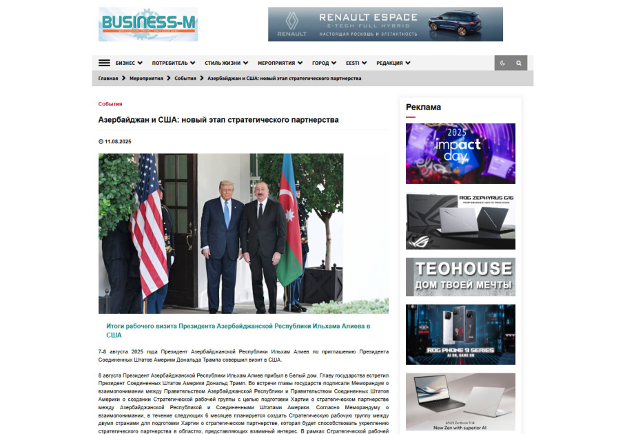“USA Today” qəzetinin “Tramp Ermənistan və Azərbaycan liderləri ilə sülh yolunda mühüm addım atdı” sərlövhəli məqaləsində bildirilir ki, Prezident Donald Tramp Ermənistan və Azərbaycan liderləri ilə Ağ vdə iki keçmiş sovet respublikası arasında onilliklərlə davam edən müharibəyə son qoyan və regionda kritik nəqliyyat vasitələrini yenidən açan Birgə Bəyannamə imzalayıb. Mərasimdə Azərbaycan Prezidenti İlham Əliyev və Ermənistanın Baş naziri Nikol Paşinyan iki dəfə Respublikaçı prezident olan Prezidenti tərifləyiblər və bir məqamda Trampın səylərinə görə Nobel Sülh Mükafatına layiq olduğunu bildiriblər. Onların Birgə Bəyannaməsi iki ölkəni birləşdirən Cənubi Qafqazdan keçən 20 millik multimodal tranzit dəhlizi olan “Beynəlxalq Sülh və Rifah naminə Tramp Marşrutu”nu müəyyən edir. Birləşmiş Ştatlar bununla bağlı müstəsna inkişaf hüquqlarına sahib olacaq.
