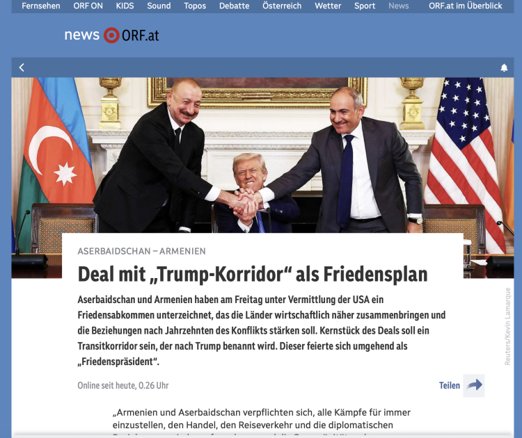 Avstriya Teleradiosu (ORF), eləcə də “Die Presse”, “Heute” “Der Standard” kimi gündəlik qəzetlər Cənubi Qafqazda davamlı sülh üçün mühüm addım atıldığını və ABŞ vasitəçiliyi ilə tərəflərin sülh sazişi istiqamətində sənəd imzaladıqlarından bəhs ediblər. Qeyd olunur ki, Azərbaycanı Naxçıvanla birləşdirəcək və Ermənistan ərazisindən keçəcək “Beynəlxalq Sülh və Rifah naminə Tramp Marşrutu”nu(TRİPP) reallaşması da razılaşmaların tərkib hissəsidir.