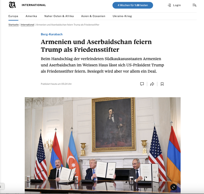 Almaniyanın “Spiegel”, “Zeit”, “Handelsblatt”, “Berliner Zeitung”, “Tagesspiegel” nəşrlərinin, “Deutusche Welle”, “Welt”, “Tagesschau” televiziyalarının və digər media qurumlarının yayımladığı xəbərlərdə Azərbaycan Prezidenti İlham Əliyevin, ABŞ Prezidenti Donald Trampın və Ermənistanın Baş naziri Nikol Paşinyanın Vaşinqtonda keçirilmiş görüşə dair Birgə Bəyannamə imzalamaları xüsusilə diqqət mərkəzində saxlanılıb.