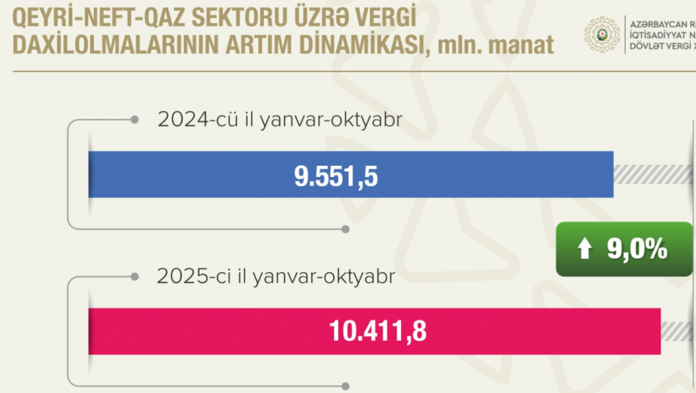 2025-ci ilin yanvar-oktyabr aylarında fiskal yığımların artımında da yüksək dinamika qeydə alınıb. Bu dövrdə xəzinədarlıq orqanları tərəfindən 1 milyon 283 mindən çox ödəniş tapşırığı icra edilib və dövlət büdcəsinin gəlirlərinin icrasında yüksək göstəricilər qeydə alınıb. Dövlət büdcəsinin gəlirləri 32,9 milyard manata yaxın olub ki, bu da on aylıq proqnozu 536,8 milyon manat və ya 1,7 faiz üstələyib. Büdcə gəlirlərində vergi daxilolmaları 14,4 milyard manat təşkil edərək proqnozdan 752,3 milyon manat və ya 5,5 faiz çox olub. Qeyri-neft-qaz sektorundan daxilolmalar 10 milyard 411,8 milyon manat olub, proqnoz 3 faiz artıq icra edilib. Əvvəlki ilin müvafiq dövrü ilə müqayisədə bu sektordan vergi daxilolmaları 860,3 milyon manat və ya 9 faiz artıb.