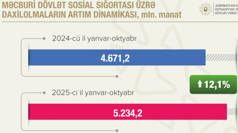2025-ci ilin yanvar-oktyabr aylarında muzdlu işçi sayının və əməkhaqqı fondunun “ağarması” prosesi şəraitində məcburi dövlət sosial sığorta haqları üzrə daxilolmalar 5 milyard 234,2 milyon manat təşkil edib. Bu mənbədən daxilolmalar əvvəlki ilin müvafiq dövrü ilə müqayisədə 12,1 faiz və ya 563 milyon manatdan çox artıb. Qeyri-büdcə təşkilatları üzrə daxilolmalar ötən ilin eyni dövrü ilə müqayisədə 12,7 faiz artaraq 3 milyard 503,5 milyon manata bərabər olub.