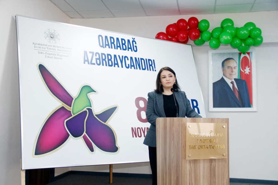 Regional İdarədən AZƏRTAC-ın bölgə müxbirinə bildirilib ki, Şəki şəhər Nizami Gəncəvi adına 7 nömrəli tam orta məktəbin akt zalında keçirilən tədbir Dövlət Himninin səsləndirilməsi ilə başlayıb, şəhidlərin xatirəsi bir dəqiqəlik sükutla yad edilib.