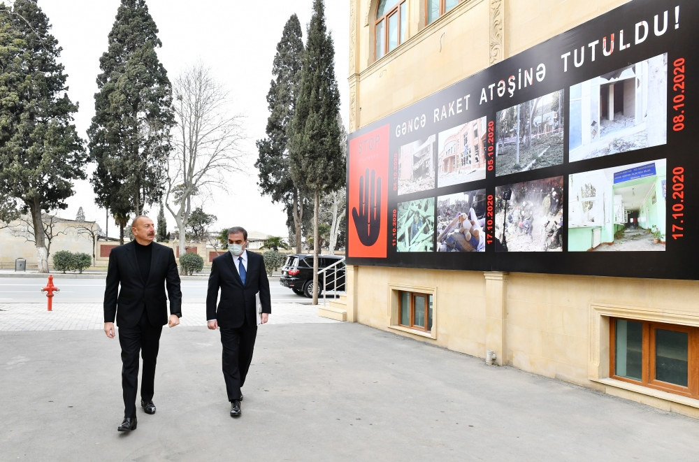 Президент Ильхам Алиев возложил цветы к мемориальному уголку мирных жителей, погибших в результате ракетных атак вооруженных сил Армении на город Гянджа.