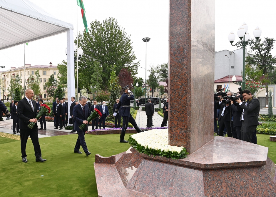 После этого Президент Ильхам Алиев и Президент Шавкат Мирзиёев возложили цветы к мемориальному комплексу.