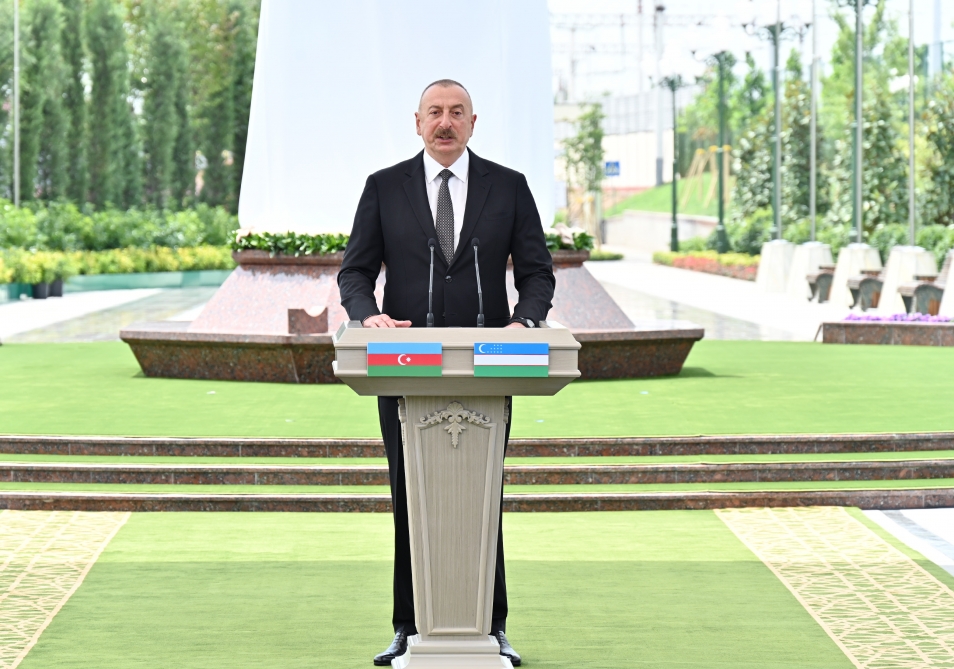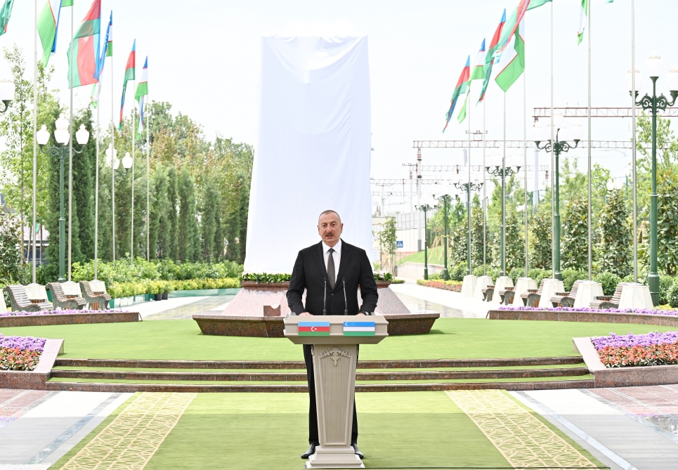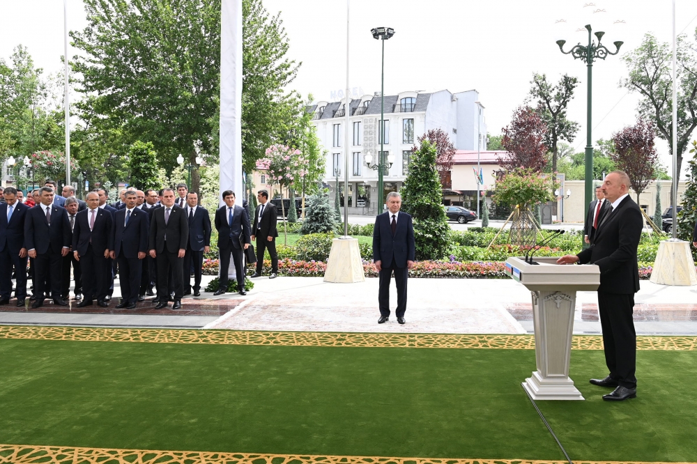 Я очень благодарен моему дорогому брату Шавкату Миромоновичу за инициативу, за создание такого прекрасного уголка в центре Ташкента, посвящённого памяти Гейдара Алиева, моего отца. Улица, площадь, барельеф, прекрасный парк – это истинно братское отношение к памяти великого лидера азербайджанского народа, ко всему азербайджанскому народу. Мы в Азербайджане это очень высоко ценим, очень благодарны, и видим в этом истинно братское отношение наших узбекских братьев к нашему великому лидеру, к нашей общей истории. Это также уважение ко всему азербайджанскому народу, которому Гейдар Алиев посвятил всю свою жизнь. Я очень благодарен Шавкату Миромоновичу за теплые слова о моем отце. Он очень ёмко и точно охарактеризовал нашего лидера. Гейдар Алиев посвятил всю свою жизнь служению Азербайджану, и в советское время, и во времена независимости был всегда рядом с народом. В самые тяжелые времена, во времена, когда наш народ подвергался агрессии, наш народ подвергался гонениям, он всегда стоял рядом с народом. 20 января 1990 года, еще почти за два года до того, как Советский Союз распался, он публично осудил советское руководство в связи с вводом советской армии в Баку и убийством и ранением сотен невинных граждан Азербайджана. Это требовало большого политического мужества. Потому что тогда еще было неизвестно сколько осталось до того, как Советский Союз уйдет в историю. Он это сделал. Он также был со своим народом в самые тяжелые времена, когда Нахчыванская Автономная Республика подвергалась агрессии, и, возглавив Нахчыванскую Автономную Республику, по существу защитил этот исторический кусок Азербайджана, древнюю землю от агрессии. Также именно по его инициативе флаг Азербайджанской Демократической Республики, которая существовала с 1918 по 1920-е годы, официально был признан государственным флагом именно в Нахчыване еще задолго до того, как Советского Союза не стало и Азербайджан восстановил свою независимость.