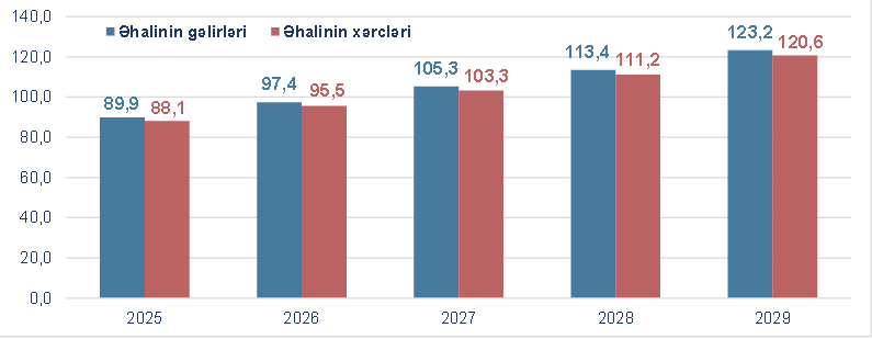 İqtisadiyyat Nazirliyi tərəfindən cari ilin ötən dövrü ərzində faktiki inflyasiya səviyyəsi, dünya üzrə əmtəə, o cümlədən ərzaq qiymətlərinin nisbətən aşağı düşməsi və bunun idxal qiymətlərinə təsiri, nominal effektiv məzənnə indeksinin dinamikası və məzənnənin sabit qalması fərziyyələri, tənzimlənən mal və xidmətlərin tariflərinin dəyişməsinin təsirləri nəzərə alınaraq baza ssenaridə cari il üzrə 5,4 faiz proqnozlaşdırılan orta illik inflyasiya tədricən azalaraq 2029-cu ildə 4,2 faiz olacağı gözlənilir. Proqnozlara əsasən ortamüddətli dövrdə əhalinin gəlirlərinin artaraq 2029-cu ildə 123,2 milyard manata, xərclərinin isə 120,6 milyard manata qədər yüksəlməsi gözlənilir. 2026-2029-cu illər üzrə manatın ABŞ dollarına qarşı məzənnəsi sabit, cari ilin səviyyəsində götürülüb.