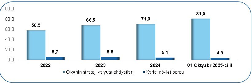Cənubi Qafqaz ölkələrində borcun strateji rezervlərin nisbətinə görə də, Azərbaycan ən yaxşı mövqeyə malikdir. Ölkəmizin strateji valyuta ehtiyatlarının həcmi 2025-ci ilin 1 oktyabr tarixinə Dövlət Neft Fondu və Mərkəzi Bankın birgə rezervləri ilə birlikdə 81,5 milyard dolları məbləğindədir. Bu isə, strateji ehtiyatlarımızın xarici dövlət borcunu 16,6 dəfə üstələdiyini göstərir.