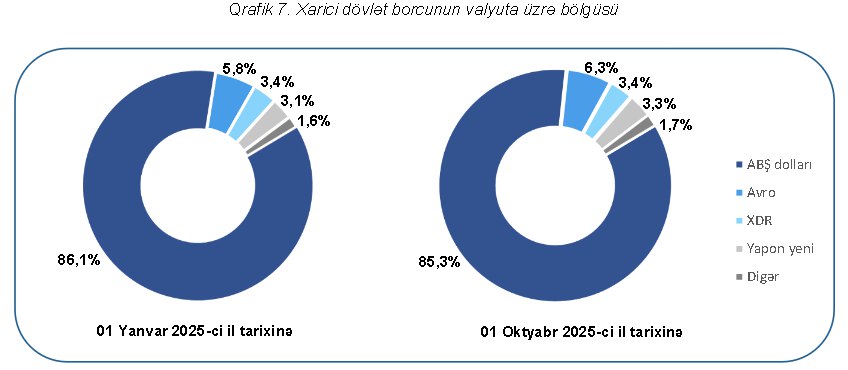 Maliyyə Nazirliyi yanında Dövlət Borcunun və Maliyyə Öhdəliklərinin İdarə Edilməsi Agentliyi tərəfindən 2025-ci ilin 9 ayı üzrə dövlət borcuna dair hesabat hazırlanıb. Sənəd dövlət borcu sahəsində şəffaflığın təmin olunması, dövlət borcu ilə bağlı ictimaiyyətə açıqlanan informasiya dairəsinin genişləndirilməsi və bu sahə üzrə məlumatlara əlçatanlığın təmin edilməsi məqsədilə dərc olunub. Agentliyin hesabatına əsasən, 2025-ci il oktyabrın 1-nə olan dövrdə, Azərbaycanın daxili və xarici borc olmaqla cəmi dövlət borcu 25 milyard 365 milyon manat olmaqla ÜDM-in 19,5 faizini təşkil edir. Maliyyə Nazirliyinin açıqladığı hesabata əsasən, borc portfelinin 8,3 milyard manatı (4,9 milyard dollar) və ya 32,8 faizi xarici dövlət borcunun (ÜDM-in 6,5 faizi ), 17 milyard manatı və ya 67,2 faizi daxili dövlət borcunun (ÜDM-in 13,1 faizi) payına düşür. Xarici dövlət borcu 2025-ci il yanvarın 1-nə olan tarixlə müqayisədə 236,6 milyon manat, daxili dövlət borcu isə 1 milyard 612,9 milyon manat azalıb. Hesabat tarixinə daxili dövlət borcunun 7, 9 milyard manatı dövriyyədə olan dövlət qiymətli kağızlarının, 9,1 milyard manatı isə hökumətin üzərinə götürdüyü dövlət zəmanətli öhdəliklərin payına düşür.