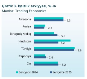 Cari ilin ötən 11 ayında dünya ölkələrində işsizlik səviyyəsi müxtəlif meyillər nümayiş etdirib. Ötən ilin eyni dövrü ilə müqayisədə işsizlik səviyyəsi Türkiyə, Hindistan və Rusiyada azalıb, Avrozonada sabit qalıb, Birləşmiş Krallıq, Yaponiya və Çində isə artıb. Bu səbəbdən Beynəlxalq Əmək Təşkilatının (BƏT) 2025-ci il üçün qlobal məşğulluq artımı proqnozunu 1,7 faizdən 1,5 faizə endirib. Bu reviziya davam edən geosiyasi qeyri-müəyyənliklər və ticarət gərginlikləri nəticəsində qlobal ÜDM artımının yavaşıması ilə daha çox əlaqədar olması ilə hesab edilir. İqtisadi Əməkdaşlıq və İnkişaf Təşkilatının (İƏİT) 2025-ci il sentyabr “İqtisadi İcmal” hesabatına əsasən, qlobal işsizlik səviyyəsi tarixi göstəricilərlə müqayisədə aşağı səviyyədə qalsa da, İƏİT ölkələrində median işsizlik 2024-cü ilin sonundan etibarən artaraq 5,5 faizə çatıb. Bu, əmək bazarlarında tədricən zəifləmə əlaməti kimi qiymətləndirilir.