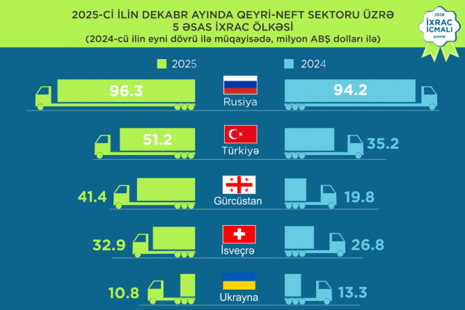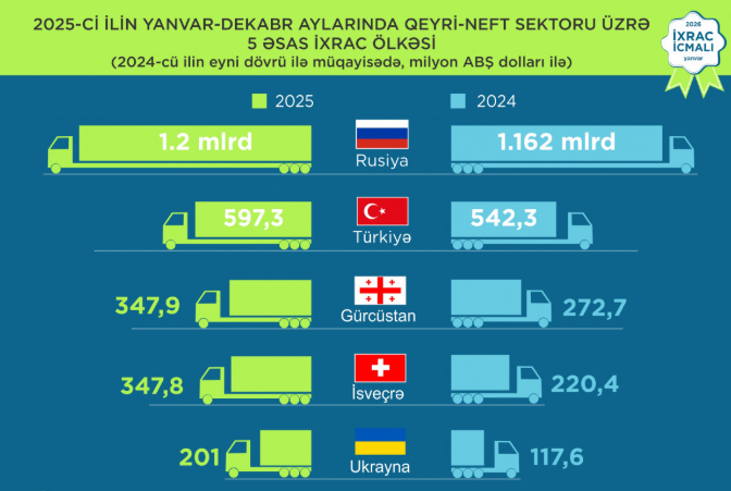 2025-ci ildə Rusiya Federasiyasına 1,2 milyard dollar, Türkiyəyə 597,3 milyon dollar, Gürcüstana 347,9 milyon dollar, İsveçrəyə 347,8 milyon dollar, Ukraynaya isə 201 milyon dollar dəyərində qeyri-neft sektoruna aid mal ixrac olunub. Ötən il qeyri-dövlət ixracatçı subyektlərin reytinqində ilk onluqda “Azərbaycan İnterneyşnl Mayninq Kompani Limited Şirkəti”nin Azərbaycan Respublikasındakı Nümayəndəliyi, “Prime Cotton” MMC, “Baku Steel Company” QSC, “Azərbaycan Şəkər İstehsalat Birliyi” MMC, “TABATERRA” QSC, “STP Alüminium” MMC, “Export Stream” MMC,”P-AQRO” MMC,”KHAN-EL” MMC, “AGRARCO” MMC yer alır.