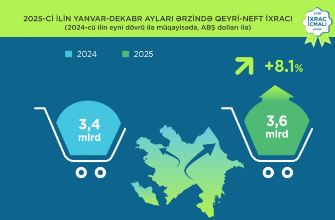 Azərbaycanın ixrac potensialının artım dinamikası ötən il də davam edib. Belə ki, 2025-ci ilin yanvar-dekabr aylarında Azərbaycanın qeyri-neft sektoru üzrə ixracı 2024-cü ilin müvafiq dövrü ilə müqayisədə 8,1 faiz artaraq 3,6 milyard dollar təşkil edib. Bu dövrdə yeyinti məhsulları üzrə ixrac 18,4 faiz artaraq 1,2 milyard dollara bərabər olub. Qeyd edilən dövrdə ixrac olunan şəkər əvvəlki ilin müvafiq dövrünə nəzərən 57,4 faiz, meyvə-tərəvəz 27,4 faiz, alüminium və onlardan hazırlanan məmulatlar 24,2 faiz, pambıq iplik 19,3 faiz, kimya sənayesi məhsulları 8 faiz, bitki və heyvan mənşəli piylər və yağlar 2 faiz artıb.