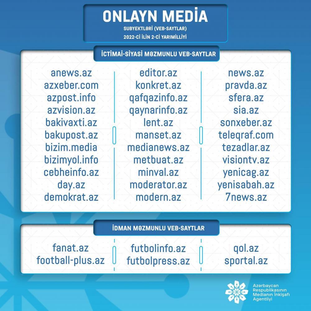Medianın İnkişafı Agentliyi tərəfindən çap mediası və onlayn media subyektlərinə (veb-saytlara) dəstək layihəsi çərçivəsində elan edilmiş müsabiqənin nəticələri açıqlanıb.