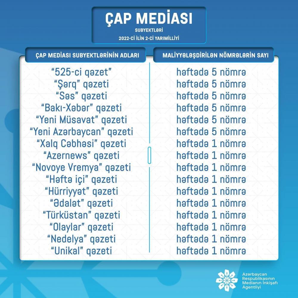 Qeyd edək ki, layihə çərçivəsində həftədə bir nömrəsi maliyyələşdirilən qəzetlərin hər birinə aylıq 5 000 manat, həftədə beş nömrəsi maliyyələşdirilən qəzetlərin hər birinə isə aylıq 15 000 manat məbləğində maliyyə yardımı göstərilir.