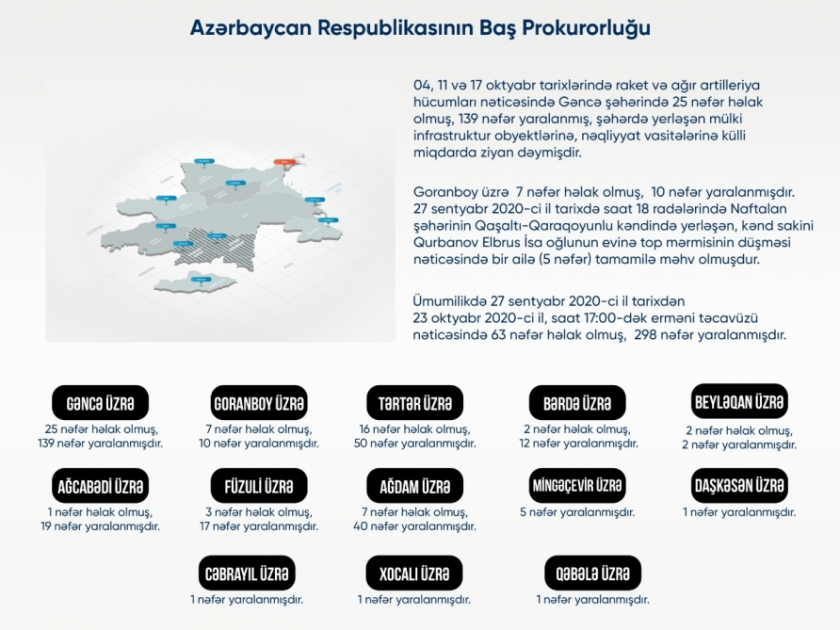 • Baş Prokurorluğun məlumatına görə, Ermənistan ordusunun yaşayış məntəqələrimizi ağır artilleriya qurğularından və raket sistemlərindən atəşə tutması nəticəsində sentyabrın 27-dən oktyabrın 23-ü saat 12:00-dək 63 mülki şəxs həlak olub, 298 nəfər xəsarət alıb, 2156 ev, 90 çoxmənzilli yaşayış binası və 398 mülki obyekt yararsız vəziyyətə düşüb.