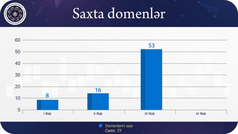 Bununla yanaşı kiberkəşfiyyat imkanlarından istifadə etməklə III rüb ərzində dövlət qurumları domenlərinə (gov.az) bənzədilmiş 53, ümumilikdə cari ilin doqquz ayı ərzində isə 77 saxta domen aşkarlanaraq bloklanması həyata keçirilib.