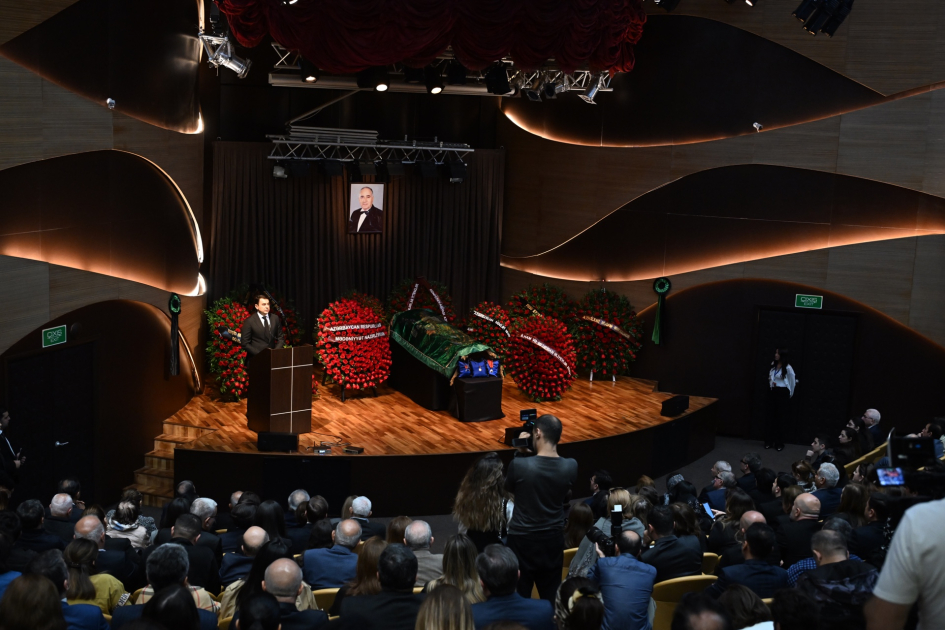 AZƏRTAC xəbər verir ki, mərhumun cənazəsi Beynəlxalq Muğam Mərkəzinin matəmsayağı bəzədilmiş səhnəsində postament üzərinə qoyulmuşdu.