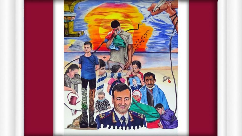 Rəsmin yuxarı hissəsində isə mənimlə anamın əlləri yer alır. Maraqlı hissələrdən biri budur ki, indiyə qədər heç vaxt anamın rəsmini çəkməmişəm. Onunla da bir izimiz olsun deyə, Mikalancelonun “Adəmin yaradılışı” əsərindən ilhamlanaraq əllərimizi qeyd etmişəm. Təbii ki ortada olan yaşıl qlobus, Qarabağ hissəsinə sancılan lələk, qollara dolanan yaşıl iplər də daxil hamısının geniş anlamı var.