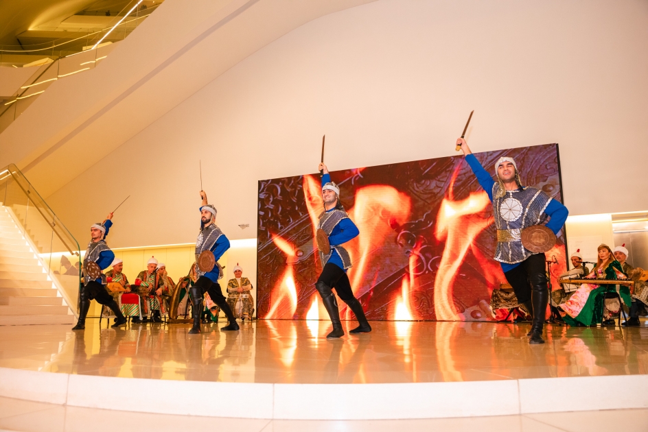 Mərkəzin foyesində ziyarətçiləri Xalq artisti Munis Şərifovun bədii rəhbərliyi ilə Qədim Musiqi Alətləri Ansamblı salamlayıb. Elə həmin məkanda Əməkdar artist Nailə Məmmədzadənin bədii rəhbərliyi ilə “Mirvari” rəqs qrupunun ifasında “Qılınclar ilə rəqs” təqdim edilib. “Helikon-opera” Moskva Musiqili Teatrının solisti Elnarə Məmmədovanın ifasında isə qədim zamanlardan bizə gəlib çatmış, hər bir azərbaycanlının qəlbində ən incə hisslərə toxunan “Sarı gəlin” xalq mahnısı səslənib.