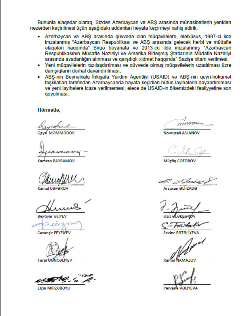 Bununla əlaqədar olaraq, Sizdən Azərbaycan və ABŞ arasında münasibətlərin yenidən nəzərdən keçirilməsi üçün aşağıdakı addımları həyata keçirməyi xahiş edirik: