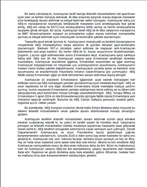 Təəssüflə qeyd etmək istərdik ki, bir sıra dairələr Azərbaycanın COP29-a ev sahibliyi edəcəyindən istifadə edərək, Azərbaycana hansısa məsələni qəbul etdirmək fikrinə düşüblər. ABŞ Senatının və Nümayəndələr Palatasının bir qrup üzvünün 2024-cü il oktyabrın 3-də bu ölkənin dövlət katibi Antoni Blinkenə göndərdiyi müraciət də bu qəbildəndir.