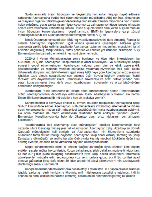 Azərbaycana qarşı irqi ayrı-seçkiliyi ehtiva edən, böhtanla dolu, dialoq ruhuna zidd olan, müharibə cinayətkarlarının azadlığa buraxılmasına və Ermənistanın hərbiləşdirilməsinə çağırış edən bu müraciət qəbuledilməzdir, beynəlxalq hüquqa ziddir və ABŞ-ın ikitərəfli münasibətlərin rəvan şəkildə davam etdirilməsində maraqlı olmadığını göstərir.