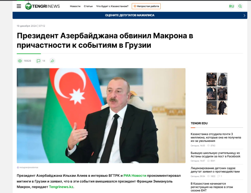 Qazaxıstanın “tengrinews” portalı yazır ki, Azərbaycan Prezidenti İlham Əliyev Fransa Prezidenti Makronun Gürcüstandakı nümayişlərə müdaxilə etdiyini açıqlayıb. Dövlət başçısı bununla bağlı qeyd edib: “Yaxşıdır ki, indi şərait artıq sabitləşməyə doğru gedir. Amma gördüyünüz kimi, yenə də Makronun qulaqları görünür. Adam öz ölkəsində otura bilmir. Mütləq Gürcüstana da əl uzatmalıdır”. Sayt Prezidentin Gürcüstanda fəaliyyət göstərən və xaricdən maliyyələşən QHT-lərlə bağlı fikirlərinə də geniş yer ayırıb.