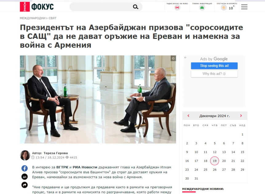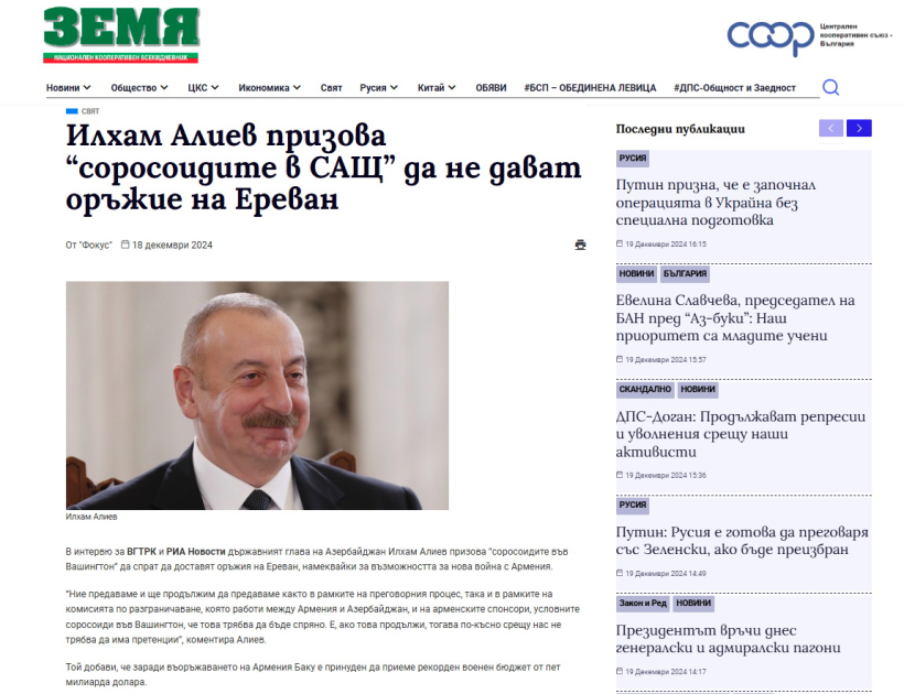 Bolqarıstanın “Zemya” xəbər portalında dərc olunan “Prezident İlham Əliyev ABŞ-dakı “Sorosçuları” Ermənistana silah göndərməməyə çağırdı” sərlövhəli yazıda, eyni zamanda, “Fokus” xəbər agentliyi müsahibə ilə bağlı materialında dövlətimizin başçısının ABŞ-dakı "Sorosçuları" Ermənistana silah göndərməməyə çağırdığını, bu addımın yeni müharibəyə səbəb ola biləcəyinə işarə etdiyi bildirib.