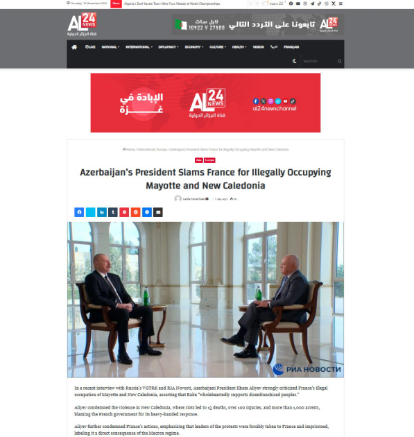 Əlcəzairin “al24news” nəşri Prezident İlham Əliyevin müsahibəsində Fransanın Mayot və Yeni Kaledoniyanın qanunsuz işğalını kəskin tənqid etdiyini bildirib. Portal dövlətimizin başçısının Yeni Kaledoniyada iğtişaşlar zamanı 13 insanın qətlə yetirilməsini, 100-dən çoxunun yaralanmasını, 1000-dən artığının isə həbs olunmasını kəskin şəkildə pislədiyini və bunlara görə Fransa hökumətini günahlandırdığını qeyd edib. Diqqətə çatdırılıb ki, Prezident İlham Əliyev bunun Makron diktaturasının nəticəsi olduğunu və Yeni Kaledoniyanı dəstəklədiyinə görə rəsmi Parisin Azərbaycanı ittiham etdiyini vurğulayıb.