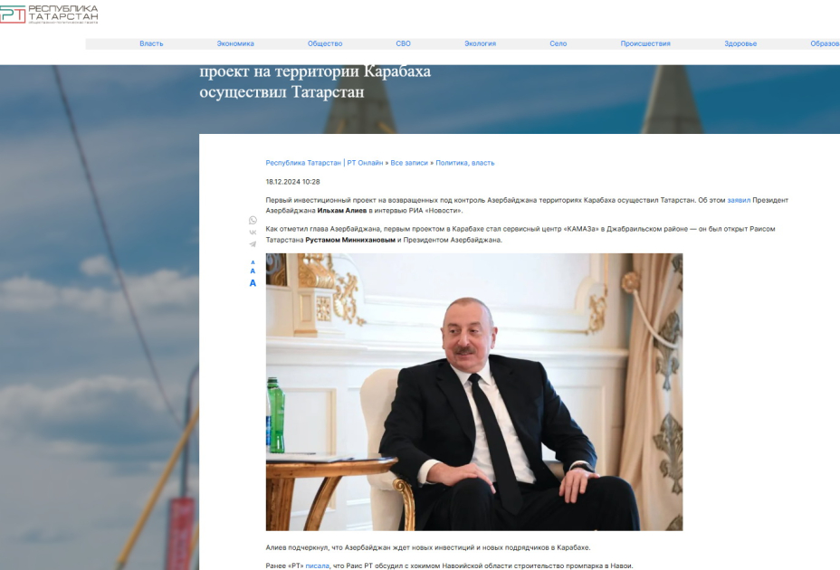 “Ustinka” portalı isə qeyd edir ki, Prezident İlham Əliyev Azərbaycanın Rusiyadan Qarabağa investisiyaların qəbul edilməsinə hazır olduğunu vurğulayıb. Bildirib ki, ilk investisiya layihəsini Tatarıstan həyata keçirib. “ Beləliklə, biz həm investisiyaları gözləyirik, həm də iş icraçılarına şad olardıq”, - deyə dövlət başçısı əlavə edib.