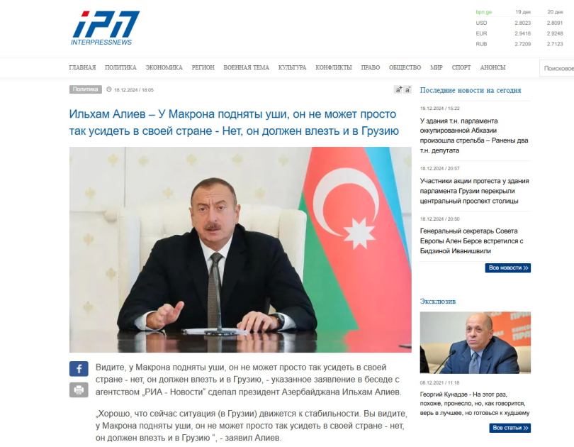 “RBK” nəşri Prezident İlham Əliyevin Gürcüstanda son günlər baş verən hadisələrə münasibətindən yazıb. Qeyd edilib ki, Azərbaycanın dövlət başçısı Gürcüstanda baş verən iğtişaşlarda Fransa Prezidenti Emmanuel Makronun əli olduğunu, öz ölkəsində rahat durmadığı və Gürcüstana da əl atdığını vurğulayıb.