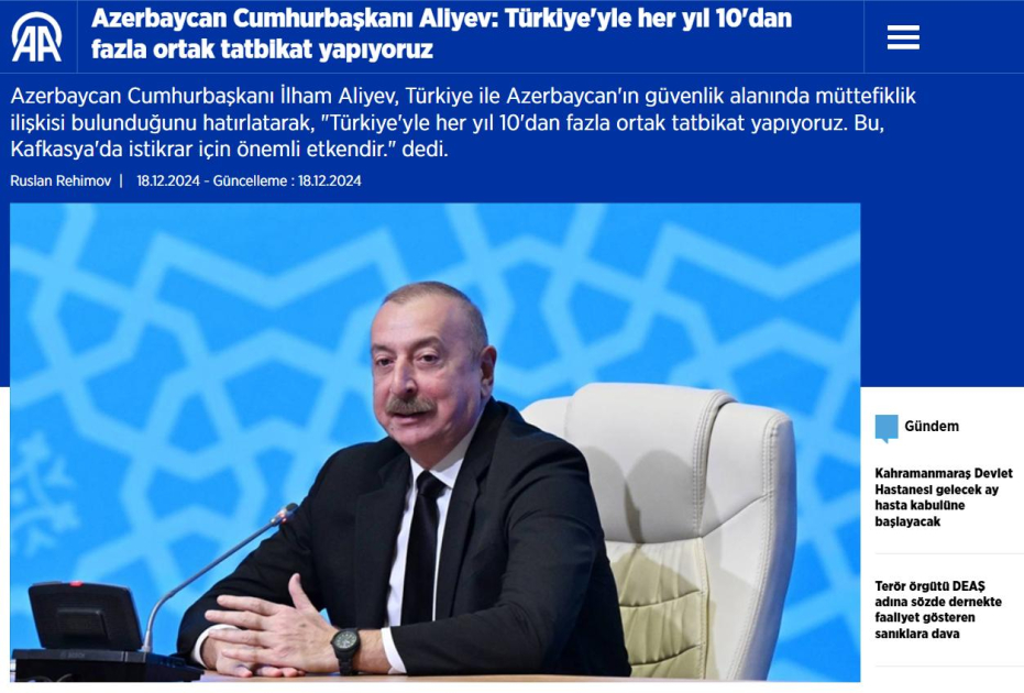 Türkiyənin Anadolu Agentliyinin, “Cumhuriyet” qəzetinin, “BengüTürk” telekanalının xəbərlərində vurğulanır ki, Prezident İlham Əliyev müsahibəsində Türkiyə ilə Azərbaycan arasında təhlükəsizlik sahəsində müttəfiqlik münasibətlərindən bəhs edərək, hər il ölkələrimizin 10-dan çox birgə təlim keçirdiyini, bunun Qafqazda sabitlik üçün mühüm amil olduğunu bildirib.