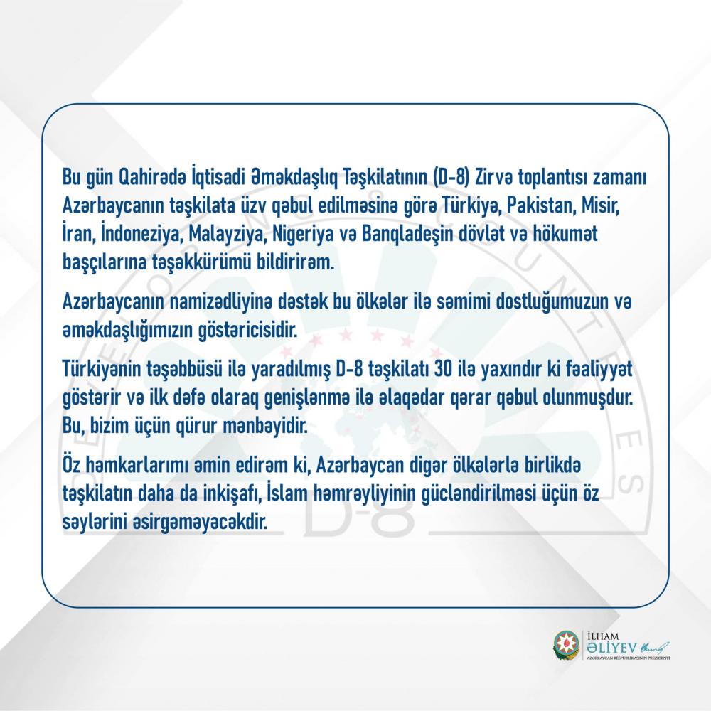 Qeyd edək ki, dekabrın 19-da Misirin paytaxtı Qahirə şəhərində İnkişaf etməkdə olan səkkiz ölkənin İqtisadi Əməkdaşlıq Təşkilatının (D-8) XI Sammitində Azərbaycan Respublikası yekdilliklə D-8 təşkilatının üzvü seçilib. Azərbaycan yaradılışından sonrakı mərhələdə təşkilatın ilk genişlənməsidir - əslində bu, olduqca mühüm bir amildir. Müsəlman dünyasının ən mühüm iqtisadi birliklərindən sayılan, mühüm siyasi perspektivə malik olan təşkilatın yaranışından sonra ilk dəfə genişlənmə planında Azərbaycanı üzv qəbul etməsi ölkəmizin qlobal aləmdəki mühüm yerini göstərir. Xatırladaq ki, üç qitəni əhatə edən D-8 4 trilyon ABŞ dollarından artıq ÜDM-ə malikdir. 130 milyard ticarət dövriyyəsi həyata keçirən, üzvlərinin əhalisinin sayının ümumilikdə, dünya müsəlmanlarının 60 faizi təşkil edən (ümumi əhali 1,2 millyarddan artıqdır) və böyük iqtisadi potensiala malik “İslam Səkkizliyi” adlanan D-8-ə ölkəmizin üzvlüyü Azərbaycanın beynəlxalq aləmdə artan nüfuzunun və ölkəmizə olan etimadın bariz nümunəsidir.