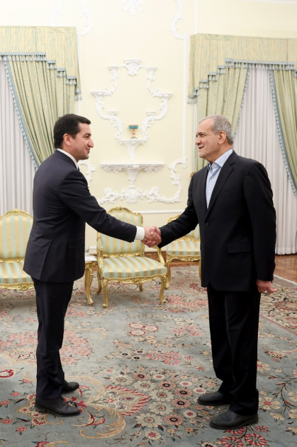 İran İslam Respublikasının Prezidenti Məsud Pezeşkian Azərbaycan Prezidentinin köməkçisi - Prezident Administrasiyasının Xarici siyasət məsələləri şöbəsinin müdiri Hikmət Hacıyevi qəbul edib.