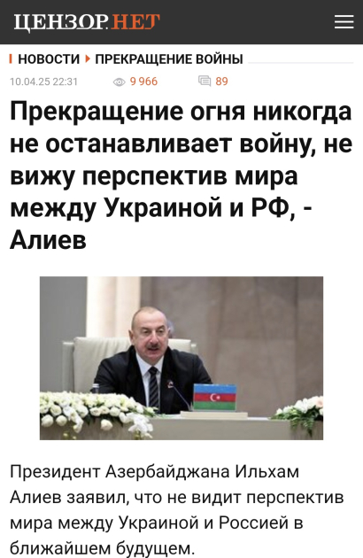 “Şəxsən mən realist olaraq, yaxın gələcəkdə Ukrayna ilə Rusiya arasında sülh üçün hər hansı perspektivi görmürəm”, - deyə məqalələrdə Prezident İlham Əliyevin sitatı qeyd olunub.