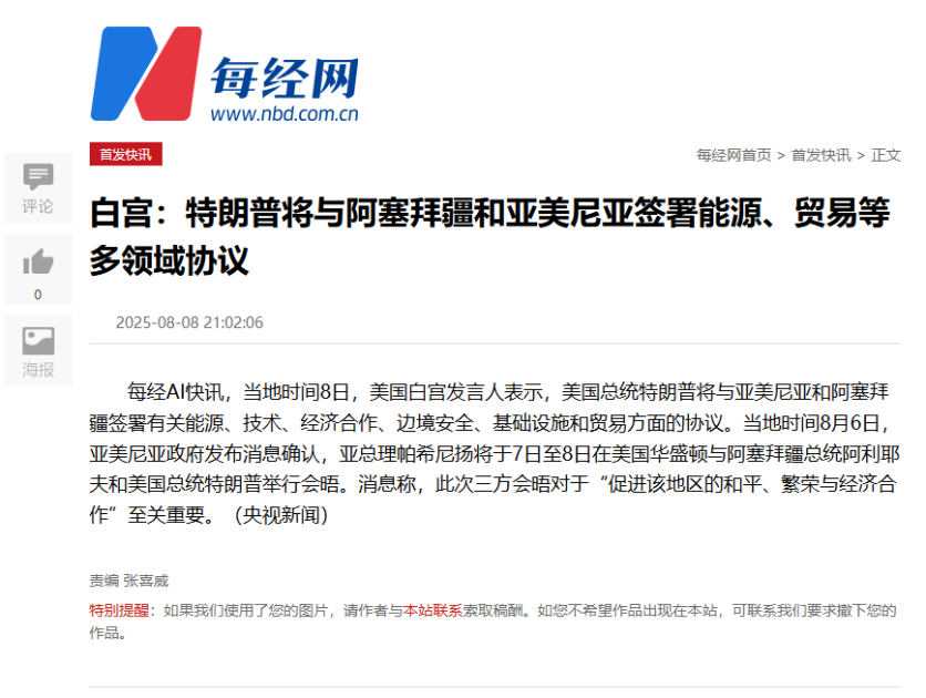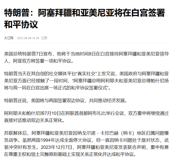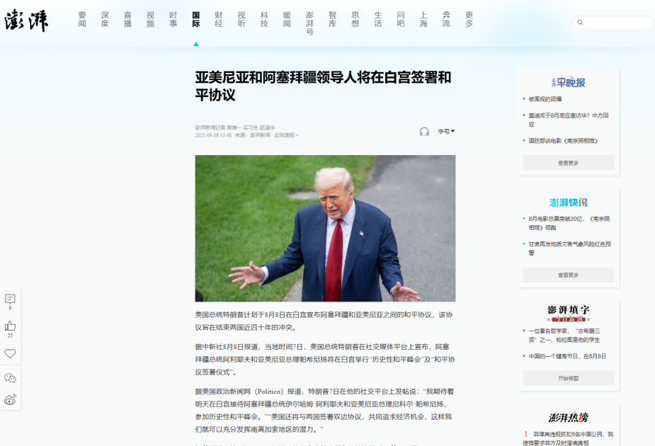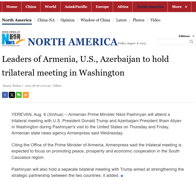 Çin mediası Vaşinqtonda Azərbaycan ilə Ermənistan arasında sülh danışıqları ilə yanaşı, Birləşmiş Ştatların Ermənistan və Azərbaycan ilə ikitərəfli iqtisadi razılaşmalar imzalamaq niyyətindən də söz açıb. Bundan başqa, Azərbaycanın əsas hissəsi ilə Naxçıvan Muxtar Respublikasını birləşdirəcək Zəngəzur dəhlizi məsələsinə də toxunulub, dəhlizin gələcəkdə yük və sərnişin daşımalarını təmin etmək məqsədilə dəmir yolu, neft və qaz boru kəmərləri, eləcə də optik internet xətlərini əhatə edəcəyi diqqətə çatdırılıb.