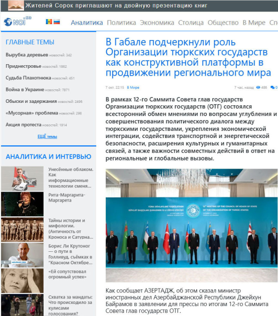 Moldovanın nüfuzlu “Noi.md” xəbər portalı Qəbələdə Türk Dövlətləri Təşkilatının Dövlət Başçıları Şurasının 12-ci Zirvə Görüşü haqqında silsilə məqalələr dərc edib. Məqalələrdə Azərbaycan Prezidenti İlham Əliyevin çıxışındakı fikirlərə xüsusi diqqət yetirilib. Dövlətimizin başçısına istinadla qeyd edilib ki, Vaşinqtonda, Ağ Evdə Azərbaycanla Ermənistan arasında sülh müqaviləsinin paraflanması Cənubi Qafqazı sülh məkanına çevirəcək. Həmçinin vurğulanıb ki, Türk Dövlətləri Təşkilatı hazırda böyük geosiyasi mərkəz kimi formalaşmaqdadır. Təşkilatın təsis sənədi olan Naxçıvan Sazişi sülh və təhlükəsizliyin əsas məqsəd və vəzifələri sırasında yer alır.