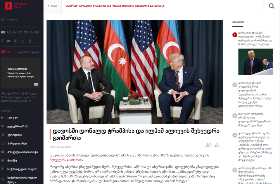 AZƏRTAC xəbər verir ki, “interpressnews.ge”, “1tv.ge”, “qafqazturk.com”, “bpn.ge”, “radiotavisupleba.ge” portalları, “1.tv” televiziya kanalı və “radiotavisupleba” radiosu Azərbaycan Prezidentinin ABŞ Prezidenti Donald Tramp, Avropa İttifaqının Genişlənmə üzrə komissarı Marta Kos və digər şəxslərlə görüşündən xəbərlər yayıblar.