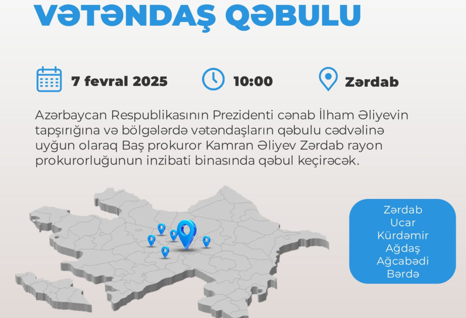 Fevralın 7-də Baş prokuror Zərdabda vətəndaşları qəbul edəcək