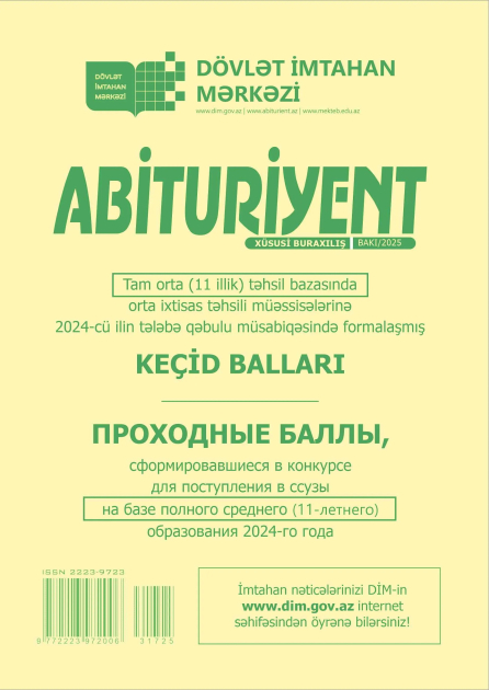 Bundan əlavə, “Abituriyent” jurnalının bu xüsusi buraxılışında tam (11 illik) orta təhsil bazasında orta ixtisas təhsili müəssisələrinə 2024-cü ilin tələbə qəbulu müsabiqəsində formalaşmış keçid balları da dərc edilib.