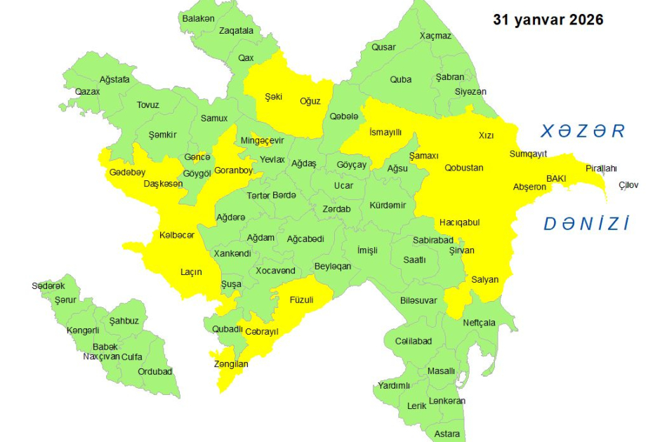 Milli Hidrometeorologiya Xidməti yanvarın 31-də Bakıda və Abşeron yarımadasında, eyni zamanda, bəzi bölgələrdə gözlənilən küləkli hava şəraiti ilə bağlı sarı xəbərdarlıq verib.