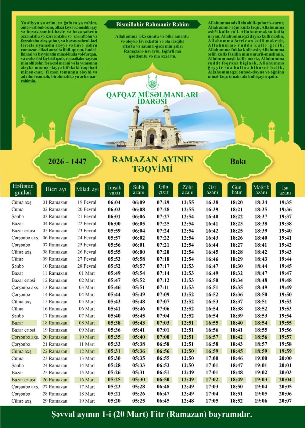 Təqvimə əsasən, Ramazan ayının ilk günü fevralın 19-na təsadüf edir. Bayram namazı isə martın 20-də qılınacaq.