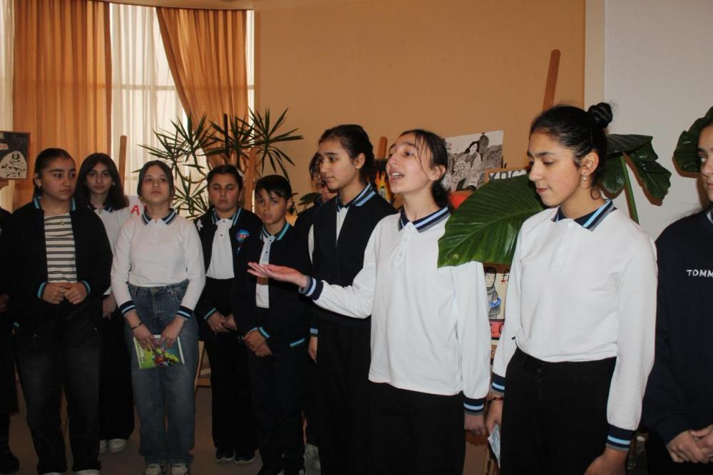 İlk öncə Xocalı faciəsinə dair məktəblilərin əl işlərindən ibarət olan sərgiyə baxış keçirilib, faciəyə həsr olunmuş şeirlər səsləndirilib.