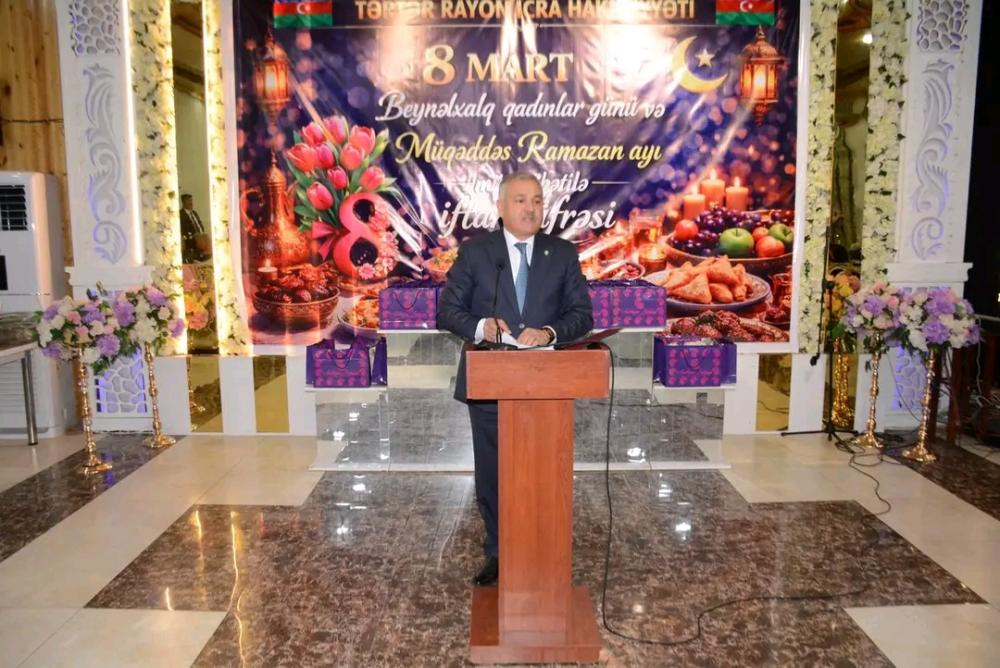 Rayon İcra Hakimiyyətinin başçısı Müstəqim Məmmədov çıxış edərək, ilk növbədə şəhid analarını və bütün tərtərli qadınları bayram münasibətilə ürəkdən təbrik edib, onlara möhkəm cansağlığı və ailə səadəti arzulayıb. O, bu ilin 8 Mart bayramının müqəddəs Ramazan ayı ilə üst-üstə düşməsinin tədbirə xüsusi mənəvi dərinlik qatdığını vurğulayıb və tutulan orucların Allah tərəfindən qəbul olunmasını diləyib.