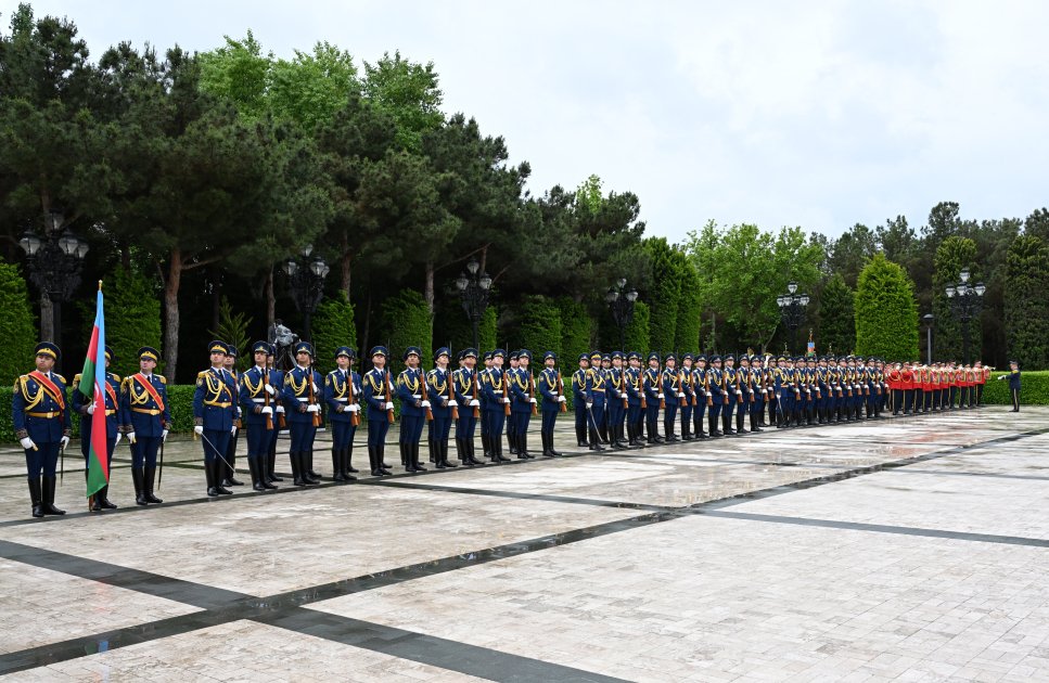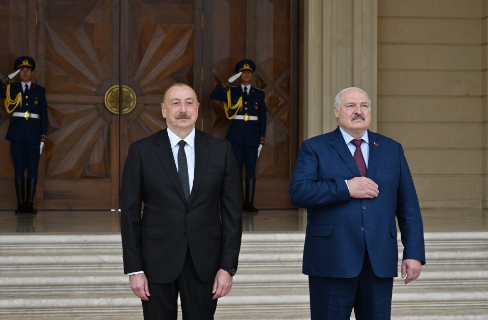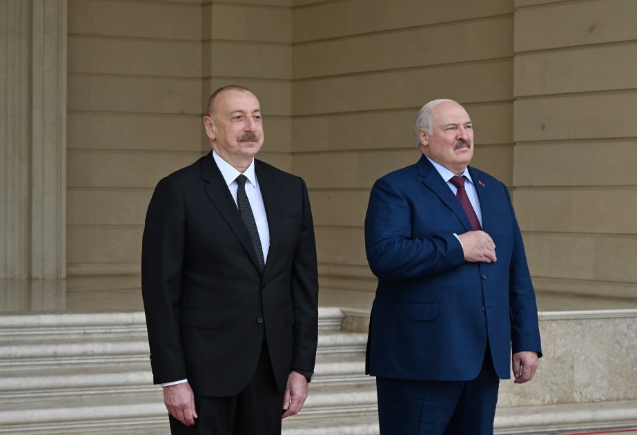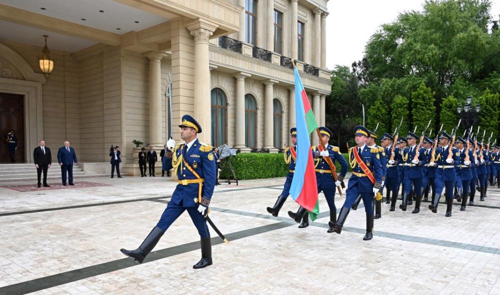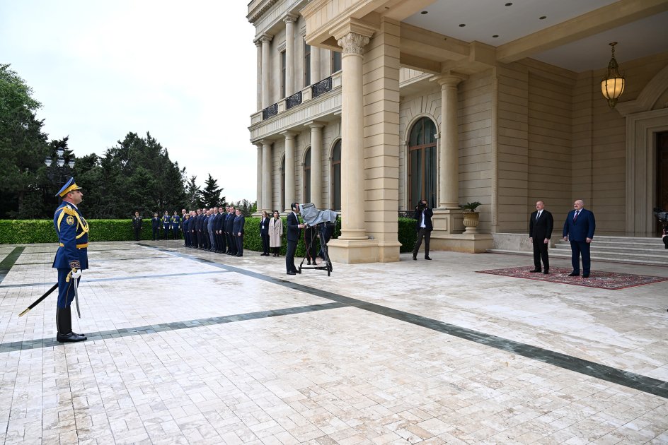 AZƏRTAC xəbər verir ki, hər iki ölkənin Dövlət bayraqlarının dalğalandığı meydanda Belarus Prezidentinin şərəfinə fəxri qarovul dəstəsi düzülmüşdü.