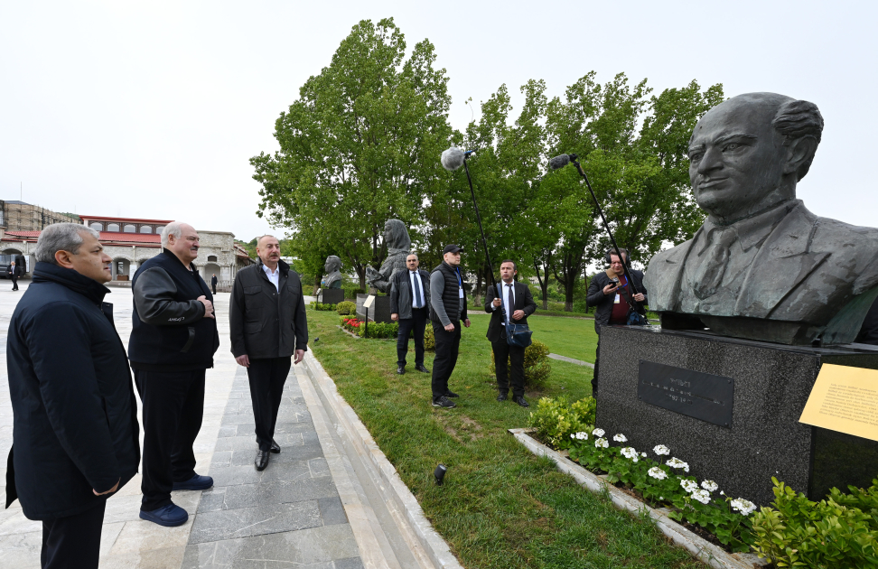 Azərbaycan və Belarus prezidentləri Şuşada Natəvanın, Bülbülün və Üzeyir Hacıbəylinin işğal dövründə gülləbaran edilmiş heykəllərinə baxıblar