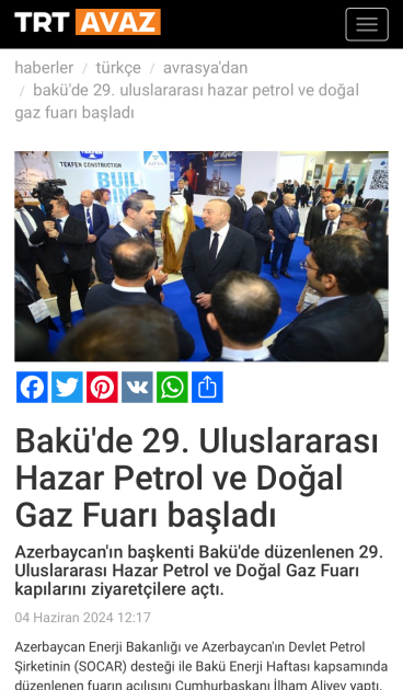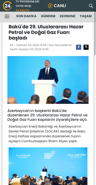 Prezident İlham Əliyevin Bakı Enerji Həftəsi çərçivəsində keçirilən 29-cu Beynəlxalq Xəzər Neft və Qaz - “Caspian Oil&Gas” və 12-ci Xəzər Beynəlxalq Energetika və Yaşıl Enerji - “Caspian Power” sərgilərinin açılış mərasimində çıxışı xarici mediada geniş işıqlandırılıb.