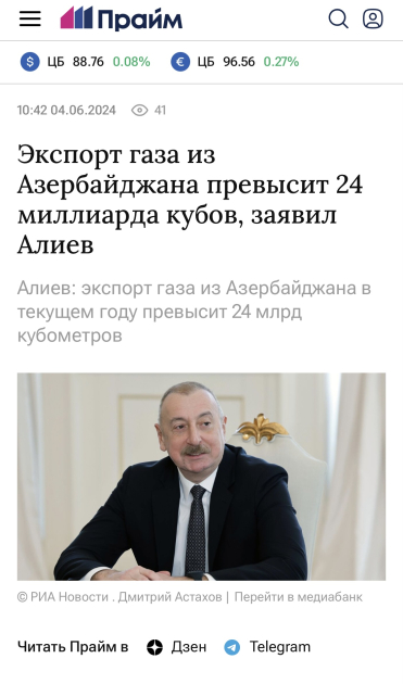 “PRIME” İqtisadi İnformasiya agentliyi dövlət başçısının bu il Azərbaycandan qaz ixracının həcminin 24 milyard kubmetrdən çox olacağı barədə dediklərinə istinad edib.