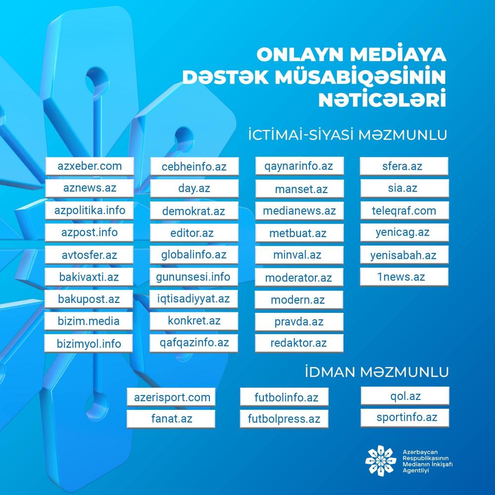 Medianın İnkişafı Agentliyi tərəfindən onlayn media subyektlərinin (veb-saytların) inkişafı, iqtisadi müstəqilliyinin gücləndirilməsi, fəaliyyətinin təkmilləşdirilməsi, habelə dövlət və cəmiyyət üçün əhəmiyyət kəsb edən layihələrin həyata keçirilməsi məqsədilə təşkil edilən müsabiqənin nəticələri açıqlanıb.