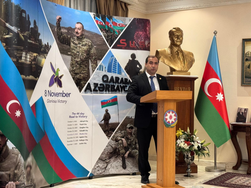 Tədbirdə çıxış edən səfir Emil Kərimov bu il Azərbaycan xalqının Vətən müharibəsində şanlı Qələbənin dördüncü ildönümünü böyük sevinc və iftixar hissi ilə qeyd etdiyini bildirib, 2020-ci ilin bu tarixində Qarabağın və Ermənistanın işğalı altında olan digər torpaqların azad edilməsinin Azərbaycanın müasir tarixinə şanlı Zəfər Günü kimi daxil olduğunu vurğulayıb. O, bu Qələbənin Müzəffər Ali Baş Komandan, Azərbaycan Prezidenti İlham Əliyevin qüdrətli rəhbərliyi, qəhrəman Azərbaycan Ordusunun şücaəti sayəsində və şəhidlərin qanı bahasına əldə olunduğunu, həmçinin Azərbaycan torpaqlarının 30 illik işğalına son qoyulduğunu, ölkəmizin ərazi bütövlüyünün bərpa edildiyini diqqətə çatdırıb. Diplomat əlavə edib ki, bu şanlı Zəfər Azərbaycan xalqının öz Prezidentinin ətrafında dəmir yumruq kimi birləşdiyini və dövlətimizin hərbi və iqtisadi gücünün artdığını bütün dünyaya bir daha nümayiş etdirdi.