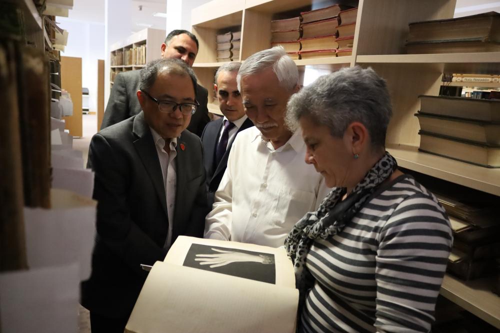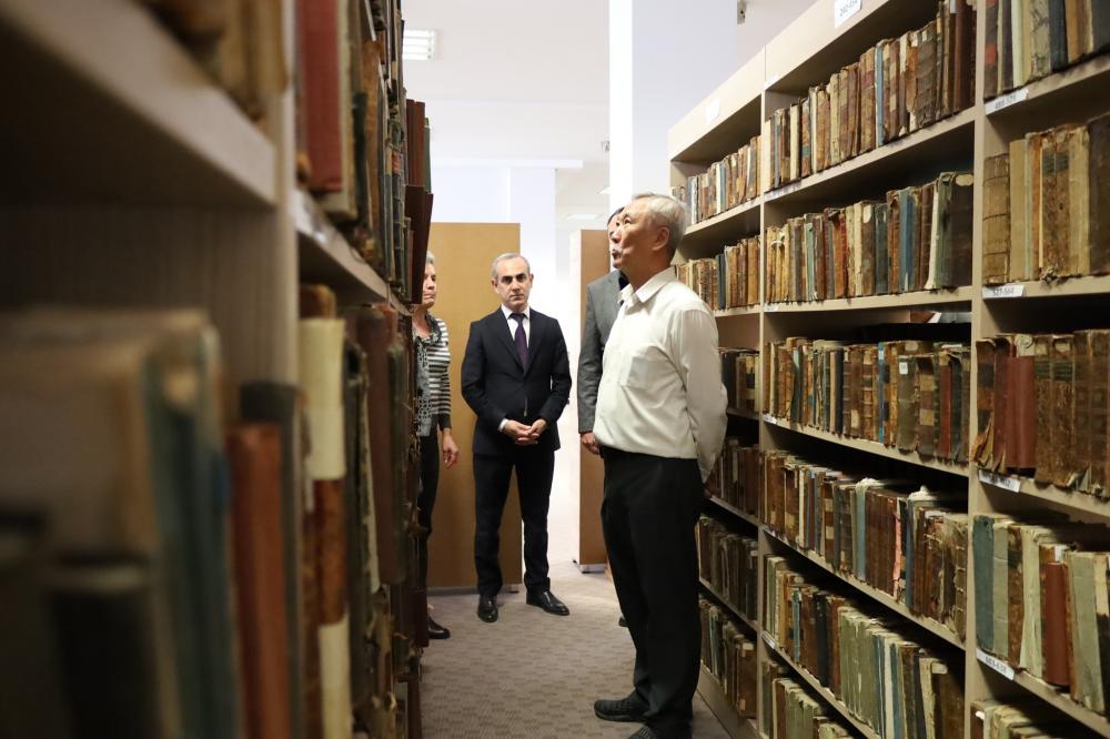 Daha sonra qonaqlar kitabxananın iş prosesi və fondları ilə yaxından tanış olublar. MEK-in Qarabağ müharibəsi qəhrəmanları, Nadir kitablar, Diplomatik fondları, oxu zalları ziyarət edilib. 44 günlük Vətən müharibəsindən sonra dövlətin dəstəyi ilə Azərbaycan kitabxana sistemində ilk dəfə MEK-də yaradılan Qarabağ müharibəsi qəhrəmanları fondunun əsas məqsədləri, fəaliyyəti və burada mövcud olan nəşrlər, guşələr haqqında ətraflı məlumat alıblar. Bundan əlavə, qonaqlar Respublikada XVI əsrə aid ən qədim kitab, nadir və qiymətli nəşrlər, həmçinin diplomatik nümayəndəliklər tərəfindən MEK-ə hədiyyə edilən ədəbiyyatlarla tanış olublar. Görüş zamanı qonaqlar MEK-də Sinqapur guşəsinin də yaradılmasını təklif ediblər.